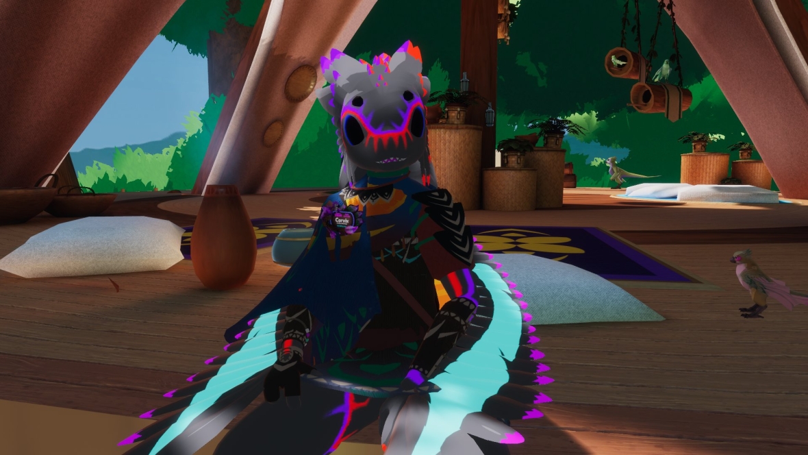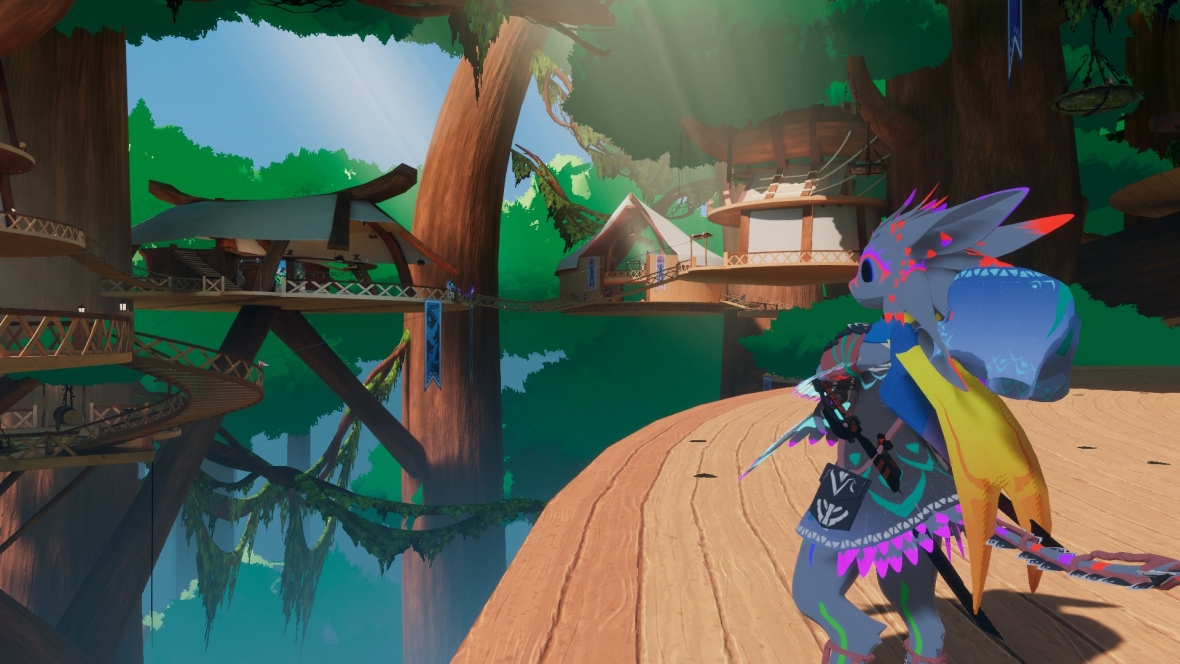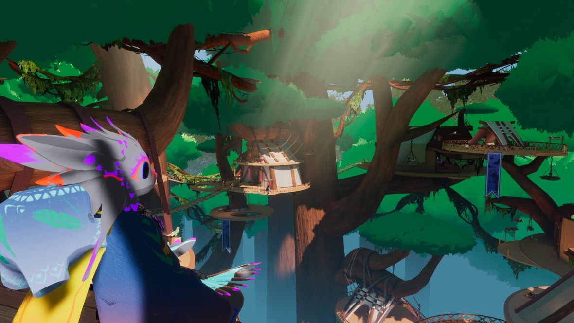 Corvix already loving the lobby world. A fear of heights, but the ziplines are hella fun. He's having a great time, and by he, I mean me. The lobby is so beautiful and calm and relaxing. #furality #furalitysylva #vrchat